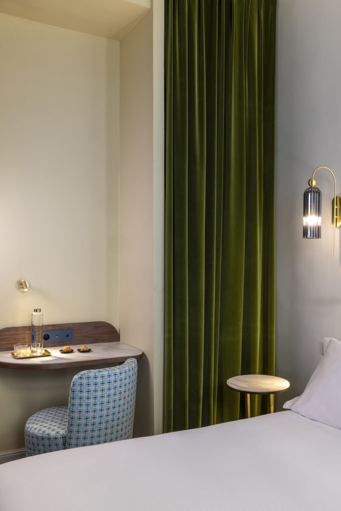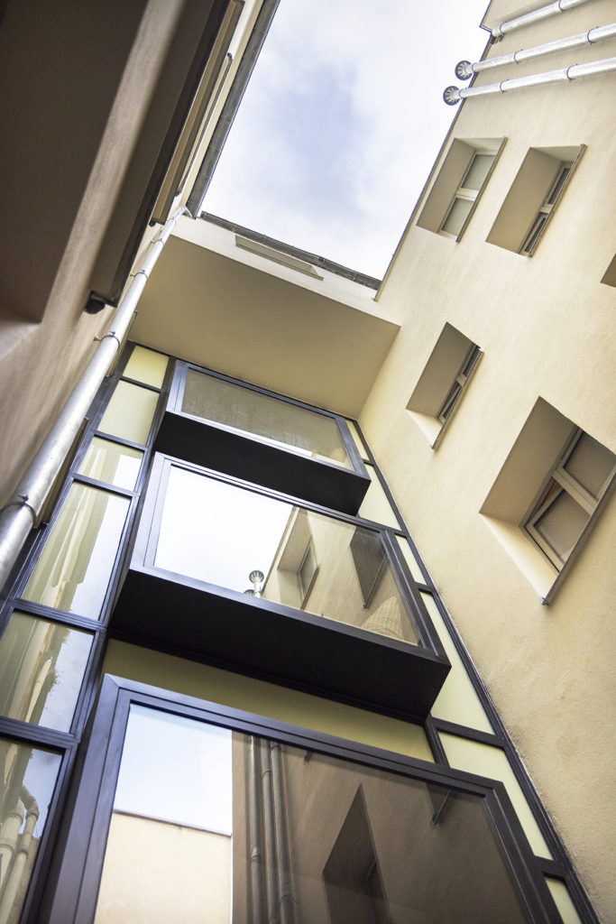 Les baies au vitrage fumé qui fermaient les coursives sont remplacées par d’élégants bow-windows contemporains, offrant une assise propice à la détente à chacune des chambres du bâtiment présent en fond de cour.